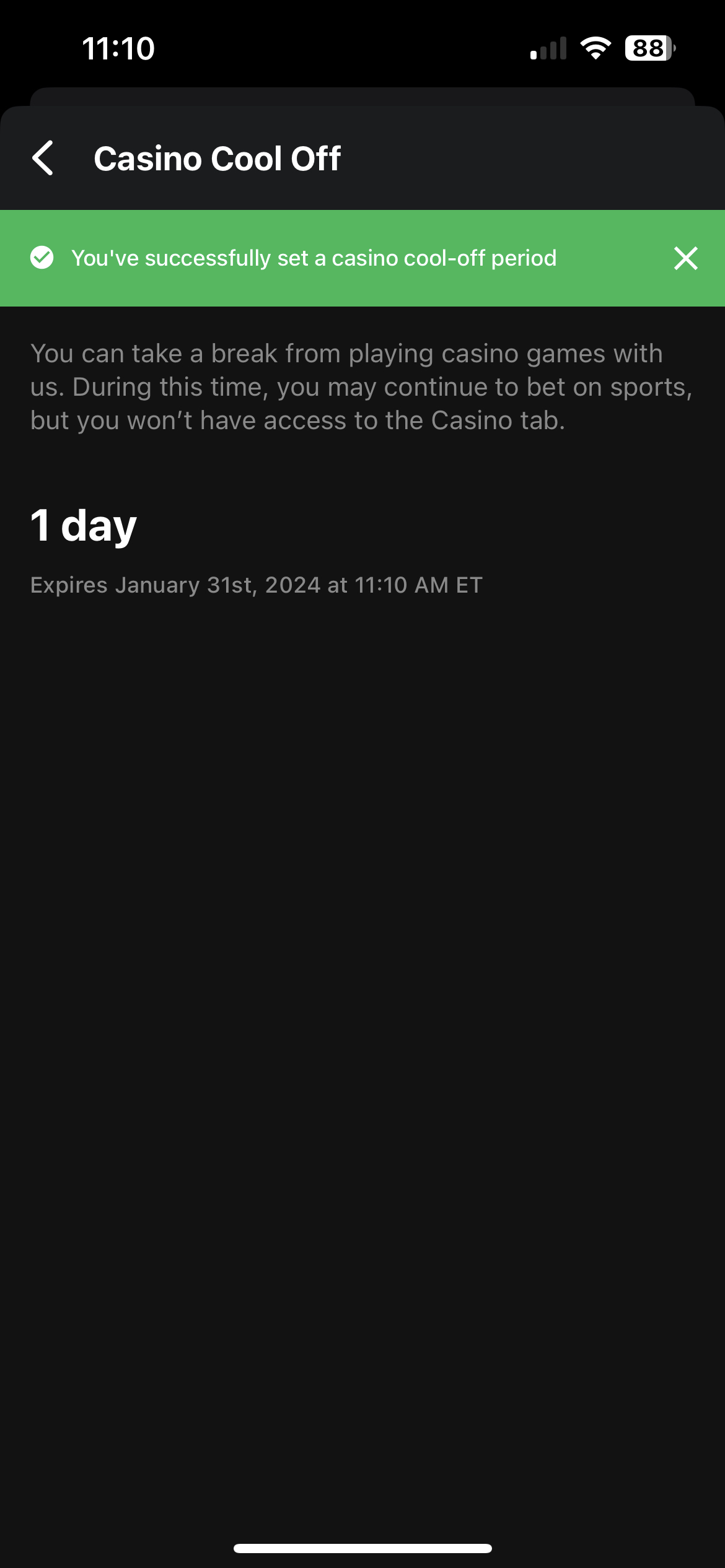 Cool Off - You can take a break from playing with us. Once you set a cool off period for your selected period of time, ranging from 1 day to 3 months, you will automatically be logged out and will not have access to place any bets or make any deposits.